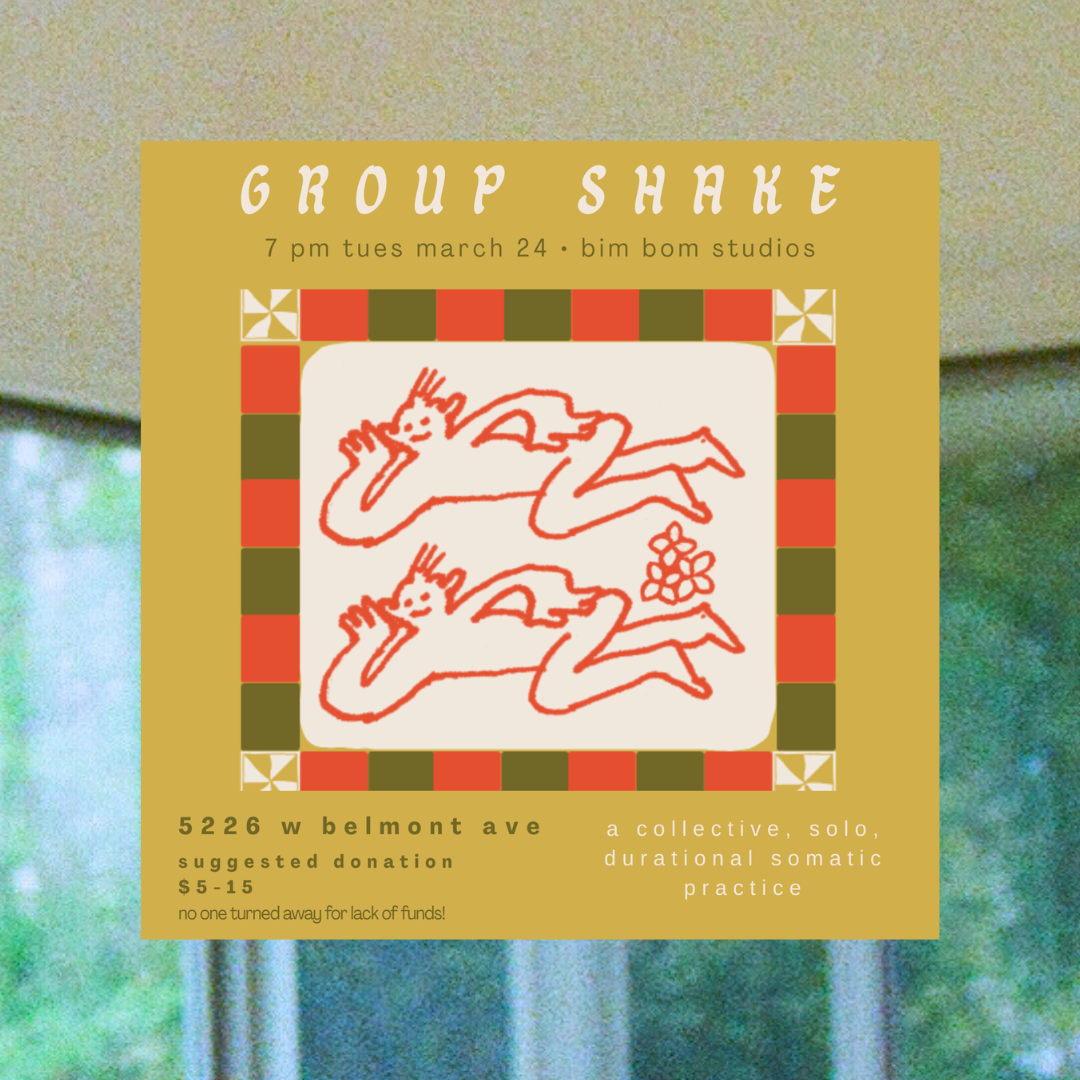 GROUP SHAKE is a collective solo durational movement practice. After a short introduction, we will move to music for an hour, focusing on shaking and rocking and allowing the body to move naturally--free from concerns about skill, rhythm, or appearance. Afterwards, there will be a closing circle to share anything that arose during the shake. This is a space for tending to your own body in community, without touch or interaction with others. It may resemble dancing, but the intention of this practice is to release tension and energy. Shaking is beneficial for circulation, nervous system and systemic health, and community building.