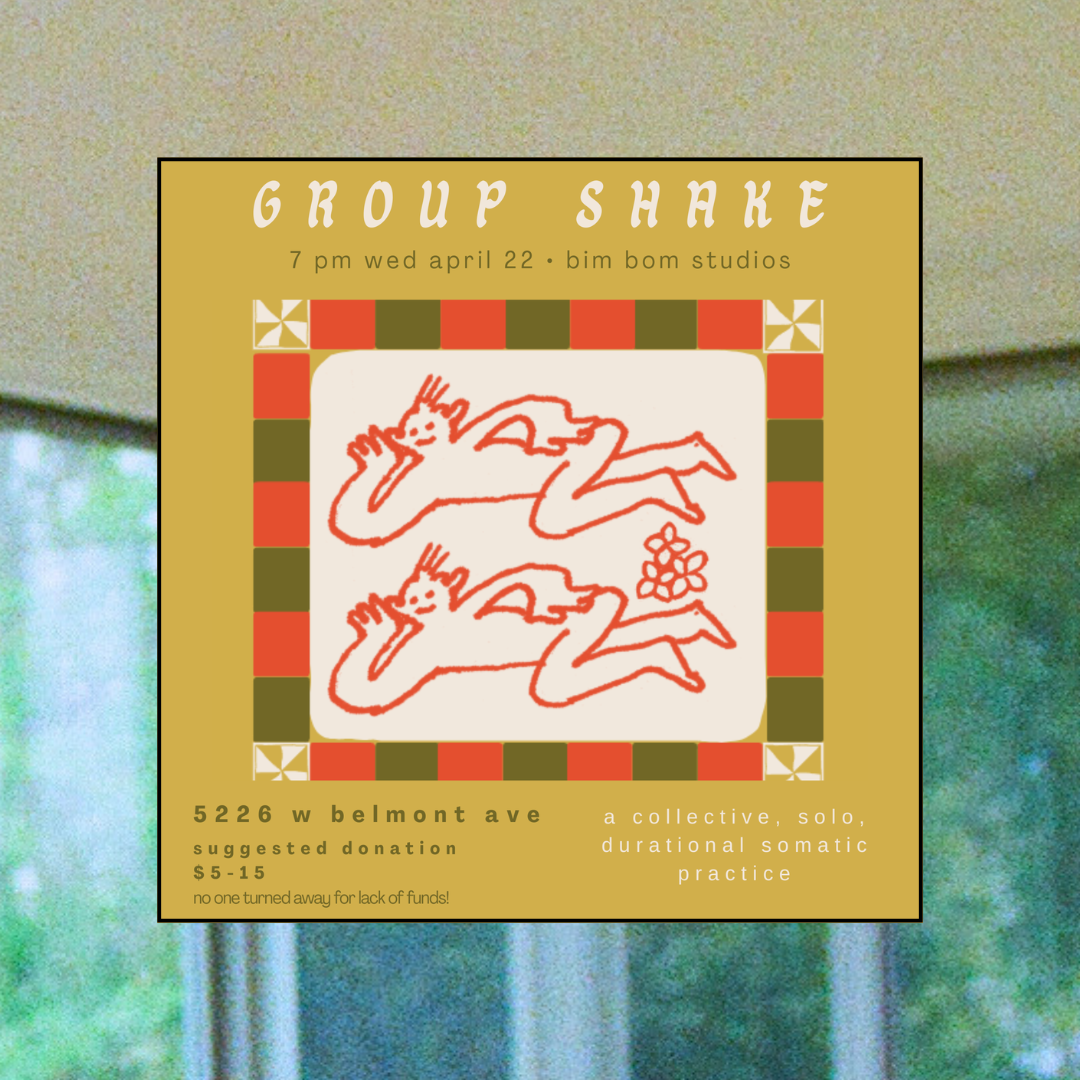 GROUP SHAKE is a collective solo durational movement practice. After a short introduction, we will move to music for an hour, focusing on shaking and rocking and allowing the body to move naturally--free from concerns about skill, rhythm, or appearance. Afterwards, there will be a closing circle to share anything that arose during the shake. This is a space for tending to your own body in community, without touch or interaction with others. It may resemble dancing, but the intention of this practice is to release tension and energy. Shaking is beneficial for circulation, nervous system and systemic health, and community building.